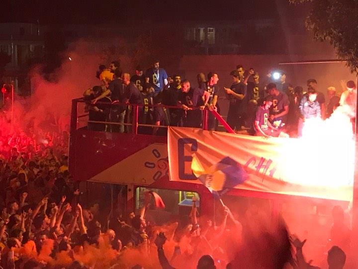 Φωτοβολίδες, συνθήματα και πανικός από τους παίκτες ήταν το σκηνικό πάνω στο λεωφορείο που μετέφερε τους παίκτες του ΑΠΟΕΛ από το ΓΣΠ στο σωματείο της ομάδας για τα πανηγύρια του πρωταθλήματος.