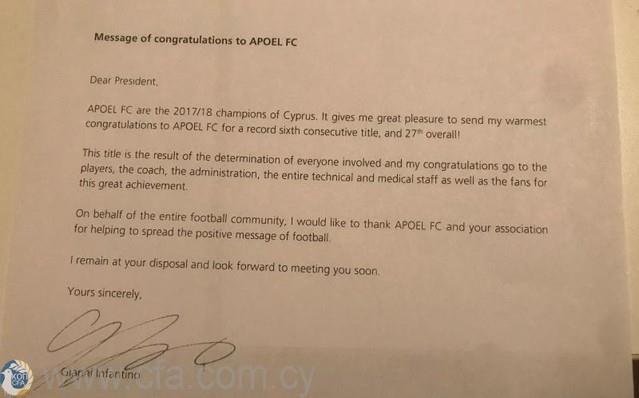 Συγχαρητήρια επιστολή για την κατάκτηση του πρωταθλήματος απέστειλε -μέσω του προέδρου της ΚΟΠ, Γιώργου Κούμα- ο Τζιάνι Ινφαντίνο. Το κείμενο του προέδρου της FIFA δημοσιοποίησε σήμερα η Κυπριακή Ομοσπονδία Ποδοσφαίρου στην ιστοσελίδα της.