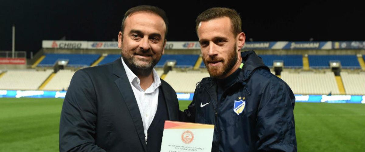 Τον Νεκτάριο Αλεξάνδρου βράβευσε πριν από την έναρξη της αναμέτρησης με τον ΑΠΟΕΛ ο πρόεδρος της Αγίας Νάπας, Κώστας Ηλία.