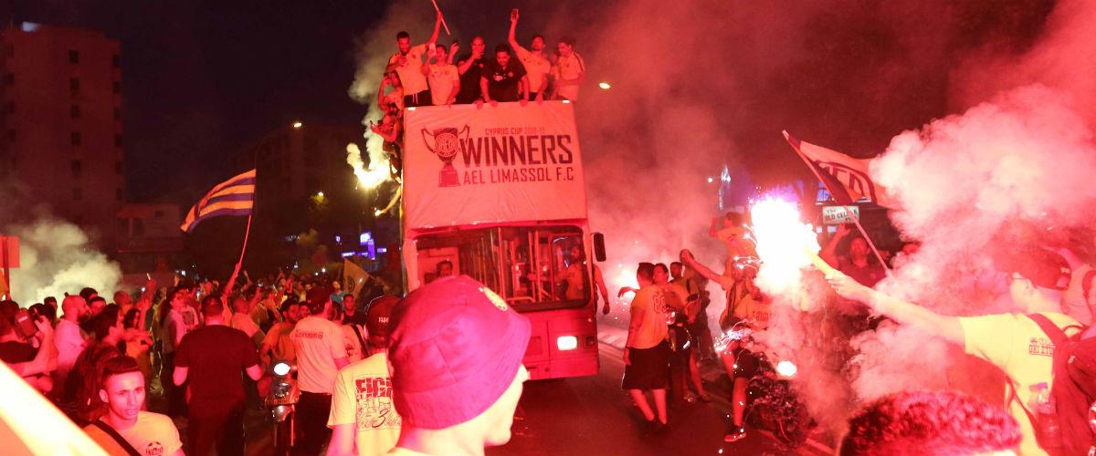 Λίγο μετά τις 20:30 άρχισαν επίσημα οι εορτασμοί από πλευράς της λεμεσιανής ομάδας με τους φίλους των κυπελλούχων να βρίσκονται από νωρίς στον Εναέριο.