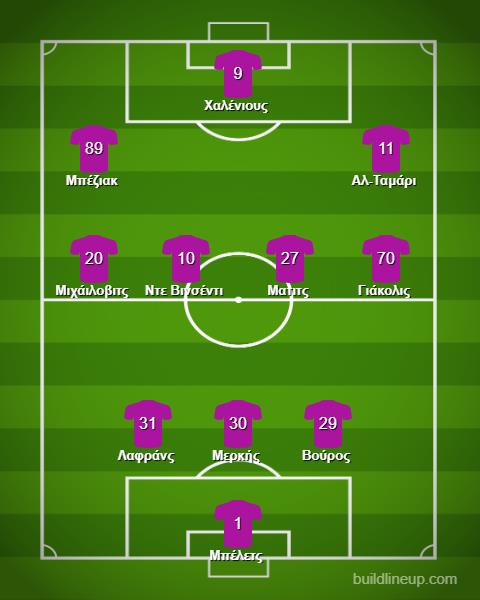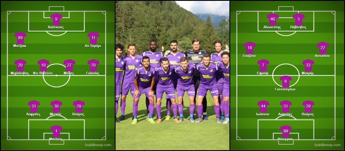 Στο αρχικό σχηματισμό τερματοφύλακας ήταν ο Σλοβένος (εν ενεργεία διεθνής) Μπέλετς, με τον Μερκή στο κέντρο άμυνας και πλάι του Βούρο (δεξιά) και Λαφράνς (αριστερά). Ακραίοι ήταν οι Μιχάιλοβιτς (αριστερά) και Γιάκολις (δεξιά). Εσωτερικοί χαφ οι Μάτιτς (δεξιά) και Ντε Βινσέντι (αριστερά). Στην επίθεση έπαιξαν Μπέζιακ (αριστερά), Αλ-Ταμάρι (δεξιά) και Χαλένιους (μπροστά).