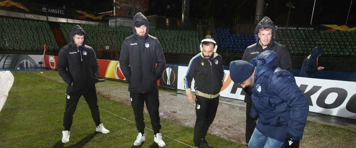 Πυρετωδώς εργάζονται οι άνθρωποι της Ντουντελάνζ για να έχουν έτοιμο το γήπεδο λίγες ώρες πριν την αναμέτρηση με τον ΑΠΟΕΛ, για την 5η αγωνιστική του Γιουρόπα Λιγκ.