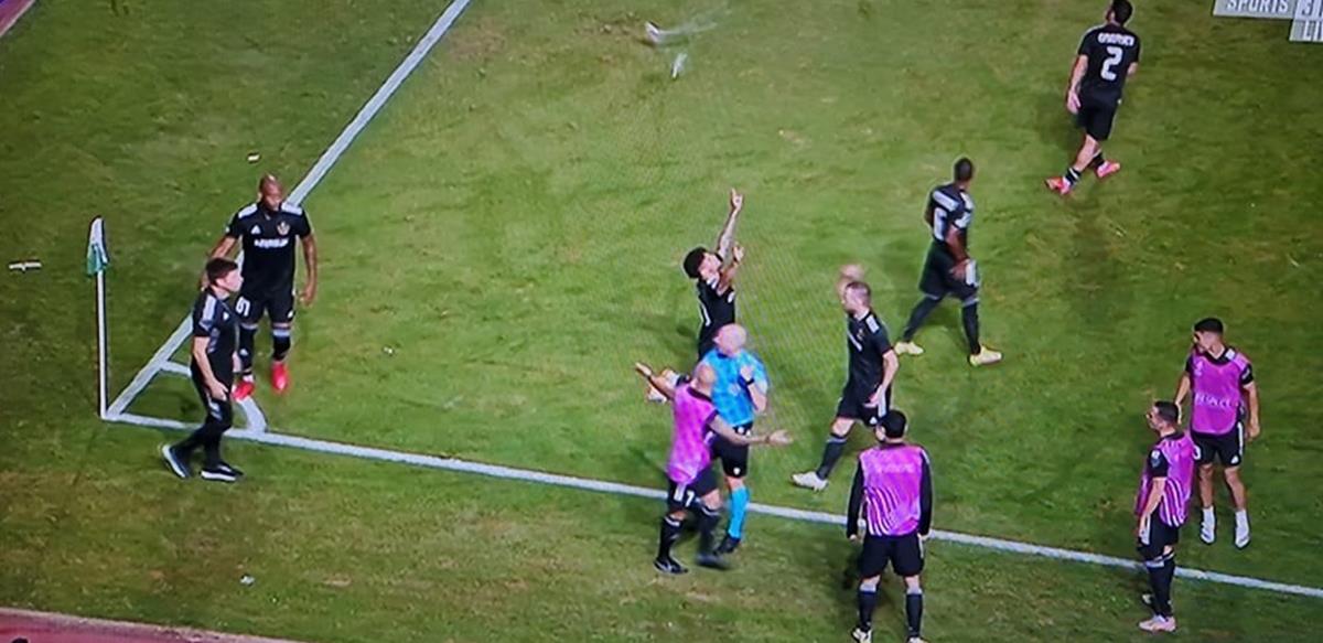 Για λίγο, έπεφταν αντικείμενα από την εξέδρα της Ομόνοιας στους παίκτες των Αζέρων, οι οποίοι αντιλήφθηκαν το λάθος τους και απομακρύνθηκαν άμεσα.