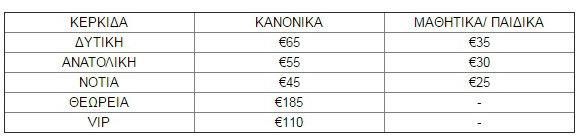 Οι τιμές διαφέρουν ανάλογα της κερκίδας και αν κάποιος είναι κάτοχος ή όχι εισιτηρίου διαρκείας. Μεμονωμένα εισιτήρια θα υπάρξουν εφόσον θα υπάρχουν διαθέσιμα εισιτήρια μετά την προπώληση των πακέτων.