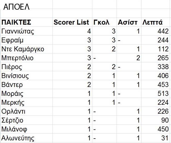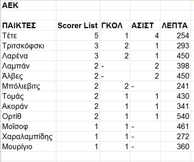 Πρώτος στην κατηγορία scorer list – αριθμός που βγαίνει από την πρόσθεση ασίστ και γκολ – είναι ο Τέτε, καθώς με τέσσερις ασίστ και ένα τέρμα είχε συμμετοχή σχεδόν στο 1/3 των τερμάτων της ΑΕΚ. Για τους γαλαζοκίτρινους την πρωτιά κατέχει ο Γιαννιώτας με εμπλοκή σε τέσσερα γκολ.
