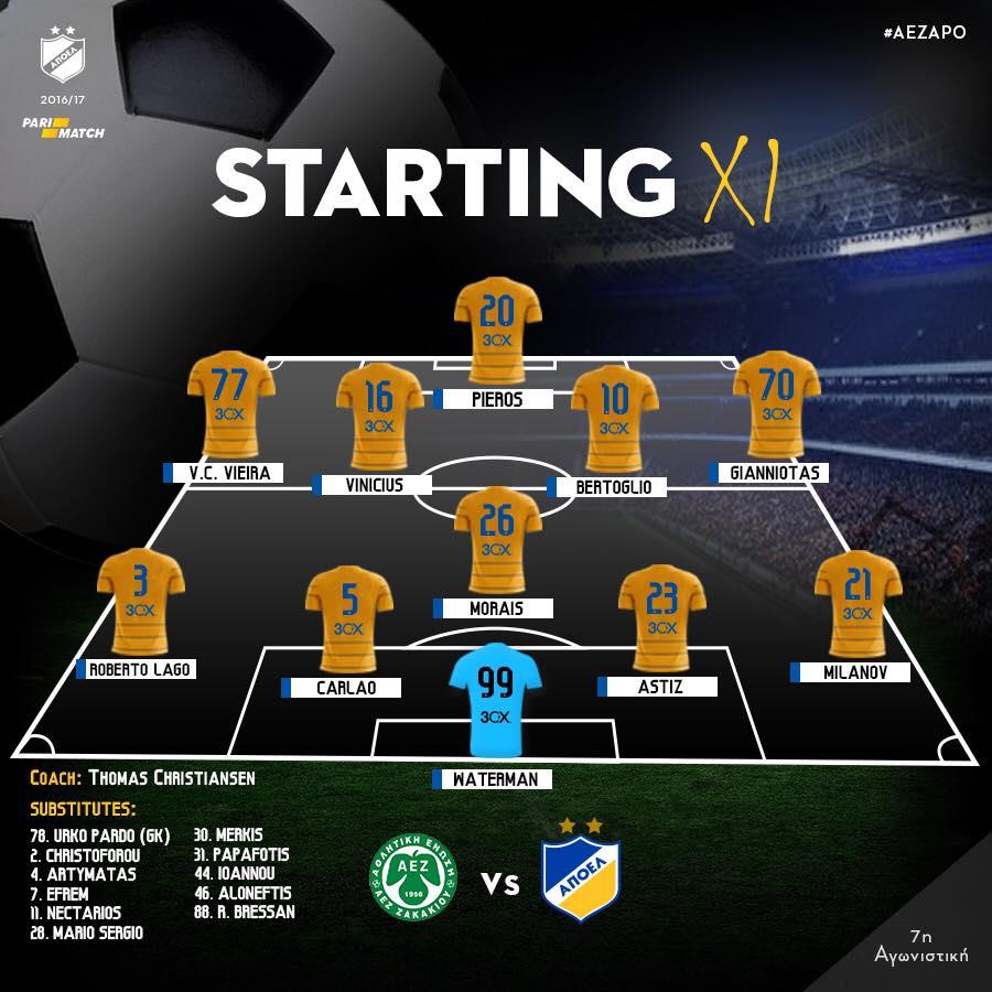 Οι Λάγο και Σωτηρίου αντί των Αλεξάνδρου και Εφραίμ ήταν οι δύο αλλαγές του Τόμας Κρίστιανσεν για το παιχνίδι με την ΑΕΖ σε σχέση με τον προηγούμενο αγώνα με την Δόξα.