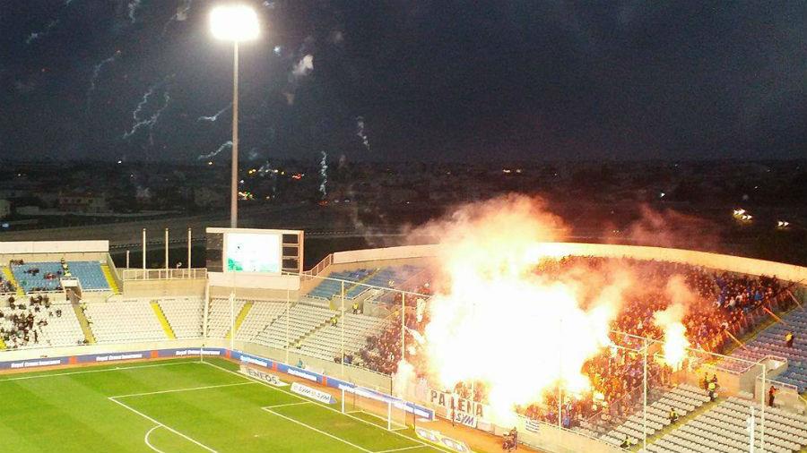 Γύρω στο 55’ οι οπαδοί του Απόλλωνα στην Νότια κερκίδα του ΓΣΠ όπου φιλοξενήθηκαν για το παιχνίδι με την Ομόνοια άναψαν πυρσούς και έριξαν βεγγαλικά.
