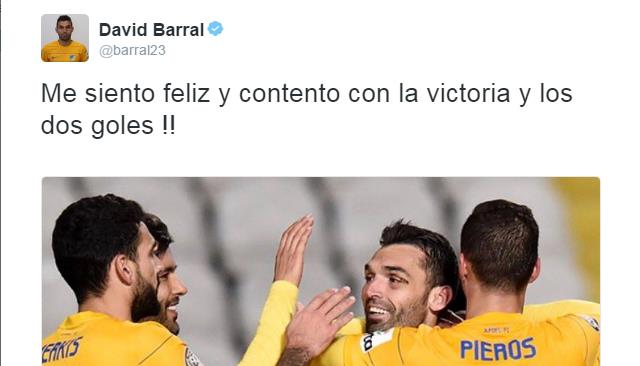 Με τον καλύτερο δυνατό τρόπο ξεκίνησε ο νεοαποκτηθείς Νταβίντ Μπαράλ στο ντεμπούτο του με τη «γαλαζοκίτρινη» φανέλα. Ο Ισπανός επιθετικός αφού πέτυχε τα δύο τέρματα κόντρα στην ΑΕΖ, γράφει στον προσωπικό του λογαριασμό: