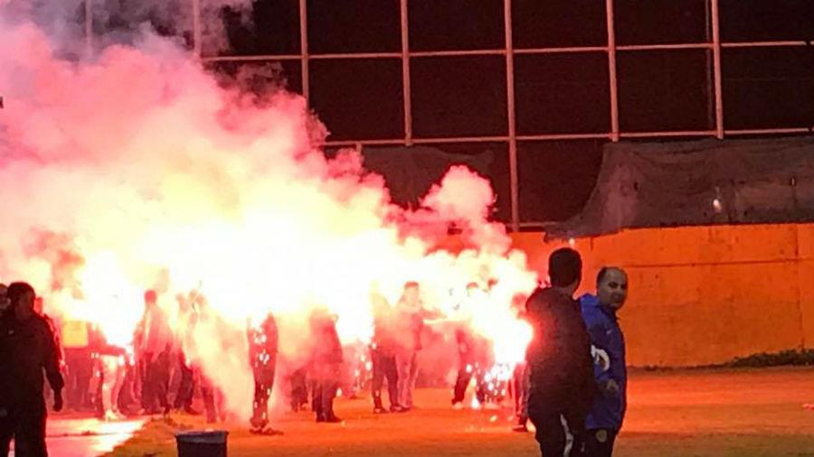 Οι οργανωμένοι της ΑΕΛ έδωσαν ρυθμό με συνθήματα, ανάβοντας φωτοβολίδες και ρίχνοντας πυροτεχνήματα.