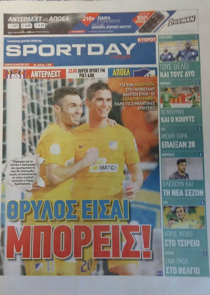 Όπως αναμενόταν, κύριο θέμα στις εφημερίδες της Πέμπτης (16/03) είναι η προσπάθεια του ΑΠΟΕΛ στις Βρυξέλλες για ανατροπή του 1-0 κόντρα στην Άντερλεχτ. Το παιχνίδι θα αρχίσει στις 22:05.