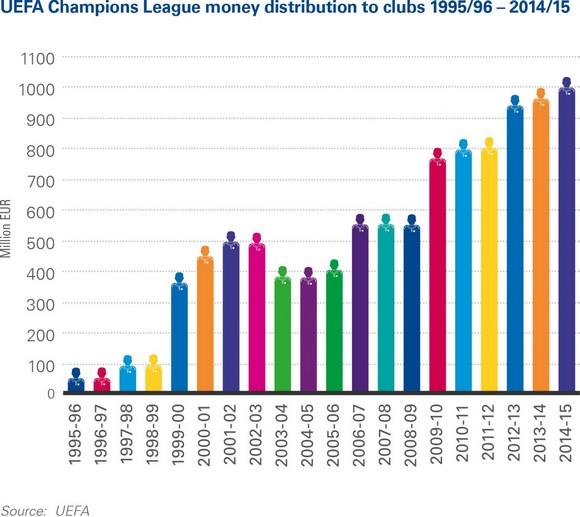 Σύλλογοι που έχουν υπέρογκα έσοδα από τις λίγκες τους και μοιράζονται πια και μεγάλο μερίδιο από τα κέρδη του Champions League. Ο πίνακας είναι χαρακτηριστικός για τα ποσά που υπάρχουν διαθέσιμα (σε εκατομμύρια ευρώ) στο θεσμό από τη σεζόν 1995/96 έως πέρσι.