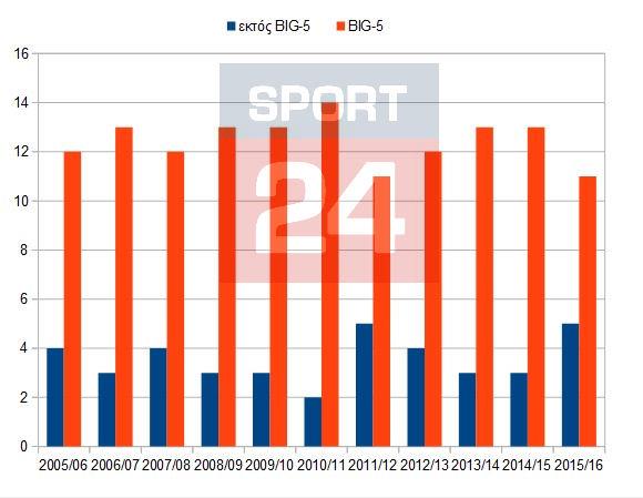 Συμπέρασμα: Οι ομάδες του BIG-5, που έχουν ήδη προβάδισμα λόγω των εσόδων από τα πρωταθλήματά τους, υπερισχύουν και αγωνιστικά έναντι των υπόλοιπων "φτωχών" της Ευρώπης. Κάνουν "κατάληψη" στους "16" του Champions League, δυναμώνουν και άλλο παίρνοντας τα περισσότερα έσοδα από το θεσμό και "εξαφανίζουν" τους υπόλοιπους. Μόλις 1 στις 8 ομάδες τα τελευταία χρόνια μπαίνει στους "8" πλην BIG-5 και ΚΑΜΙΑ στα ημιτελικά. Το σχέδιο του Πλατινί μπορεί να διεύρυνε το θεσμό στους ομίλους, με αποτέλεσμα να βλέπουμε συλλόγους όπως η Αστάνα, αλλά οι επόμενες φάσεις είναι υπόθεση λίγων.