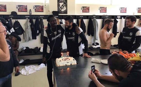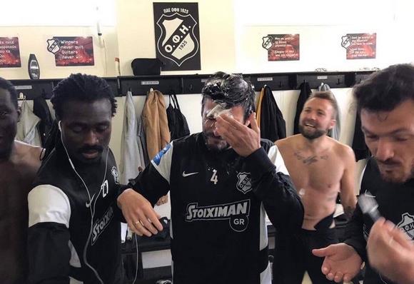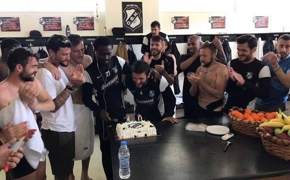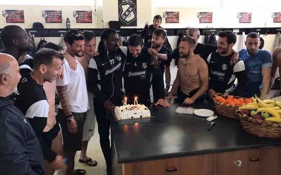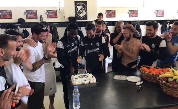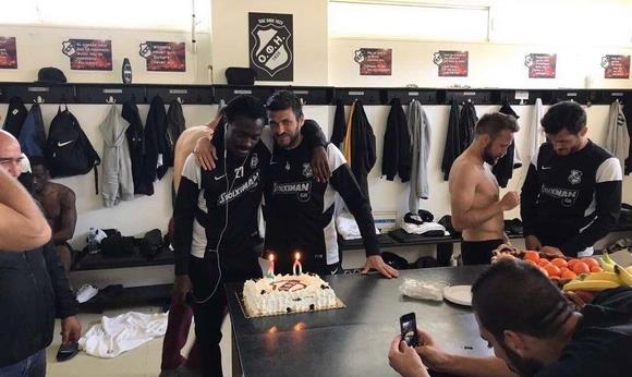 Συγκεκριμένα μια τούρτα περίμενε τον αρχηγό του ΟΦΗ, στα αποδυτήρια και ο Κώτσιος έσβησε τα κεράκια παρουσία των συμπαικτών του, οι οποίοι του έκαναν το δικό τους… πάρτι στα αποδυτήρια της ομάδας και δεν παρέλειψαν ακόμα και να πασαλείψουν με την τούρτα τον αρχηγό της ομάδας.
