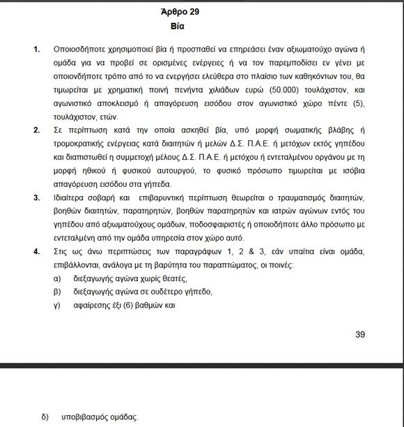 Οι Πειραιώτες κινδυνεύουν με αφαίρεση έξι βαθμών από το επόμενο πρωτάθλημα (έχει επικυρωθεί η βαθμολογία για το φετινό), βαρύ πρόστιμο, κεκλεισμένων των θυρών ή διεξαγωγή αγώνων σε ουδέτερη έδρα ενώ το άρθρο 29 κάνει λόγο ακόμα και υποβιβασμό, έστω και αν φαντάζει ακραίο σενάριο. Για την υπόθεση υπάρχουν αντικρουόμενες απόψεις και επίσης δεν υπάρχει υλικό από τις κάμερες ασφαλείας του γηπέδου.