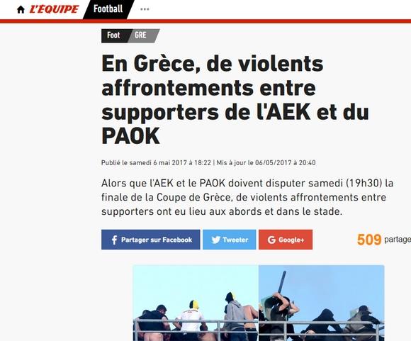 L' Equipe (Γαλλία): "Βίαιες συγκρούσεις μεταξύ οπαδών της ΑΕΚ και του ΠΑΟΚ στην Ελλάδα"