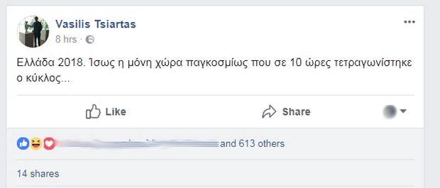 "Ελλάδα 2018. Ίσως η μόνη χώρα παγκοσμίως που σε 10 ώρες τετραγωνίστηκε ο κύκλος...", ήταν το μήνυμα του και στα σχόλια έγινε ένας μικρός χαμός.