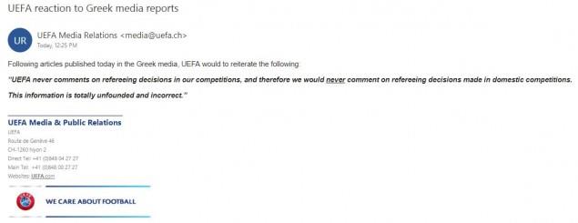 «Σχετικά με άρθρα τα οποία δημοσιεύτηκαν σήμερα σε ελληνικά ΜΜΕ, η UEFA θα ήθελε να δηλώσει τα εξής: