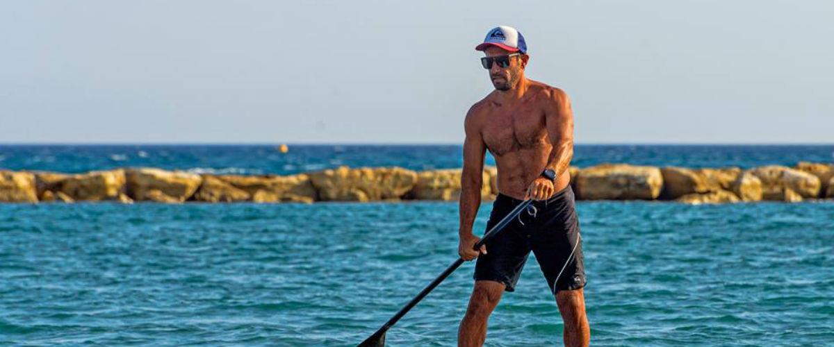 Απολαμβάνοντας τον ήλιο και τον παφλασμό των κυμάτων στην παραλία της Αγίας Βαρβάρας, στη Λεμεσό, ο προπονητής κωπηλασίας Κώστας Συμεωνίδης ξεκουράζεται λίγα 24ωρα πριν τη μεγαλύτερη πρόκληση που ο ίδιος έθεσε ποτέ στον εαυτό του, να διανύσει την απόσταση από τη Μύκονο μέχρι τη Λεμεσό, κάνοντας όρθια σανιδοκωπηλασία.