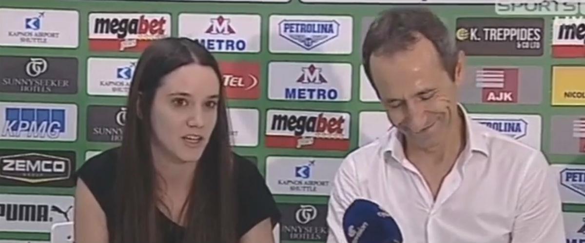 Η κοπέλα μετάφρασε δύο παραγράφους που πρόλαβε από όσα είπε ο κόουτς της ομάδας της Λευκωσίας, ο οποίος αντιλαμβανόμενος ότι τα είπε όλα χύμα, ζήτησε συγνώμη.
