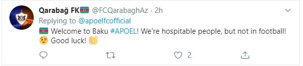 Ο ΑΠΟΕΛ, με ανάτρηση του στα μέσα κοινωνικής δικτύωσης κοινοποίησε πως η ομάδα έφτασε στο Αζερμπαϊτζάν, με τους Αζέρους να απαντούν με ειρωνικό ύφος στην ανάρτηση των γαλαζοκιτρίνων, λέγοντας "Είμαστε φιλόξενοι, όχι στο ποδόσφαιρο όμως".