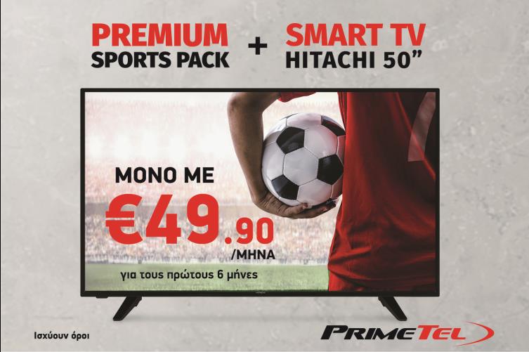 Συγκεκριμένα, οι λάτρεις της στρογγυλής θεάς έχουν τη δυνατότητα να αποκτήσουν σε προνομιακή τιμή, το πακέτο PrimeTel Premium Sports με internet 10 Mbps και επιπλέον τη νέα 4Κ Smart TV 50” της Hitachi μόνο με €49.90 για τους πρώτους έξι μήνες!
