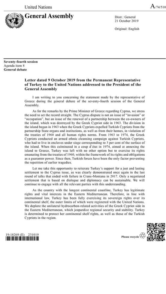 Μια προκλητική επιστολή διαμαρτυρίας προς τον ΟΗΕ, ημερομηνίας 9 Οκτωβρίου, έστειλε ο μόνιμος εκπρόσωπος της Τουρκίας στα Ηνωμένα Έθνη, πρέσβης Φεριντούν Σινιρλίογλου, κάνοντας λόγο για «εθνοκάθαρση» των Τ/κ από Ε/κ μεταξύ 1963 και 1974, επιχειρώντας να δικαιολογήσει την τουρκική εισβολή το 1974.