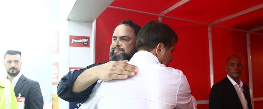 Ο ισχυρός άνδρας του Ολυμπιακού Βαγγέλης Μαρινάκης κατέβηκε στα αποδυτήρια και συνεχάρη την ομάδα για τη νίκη επί της ΑΕΚ.