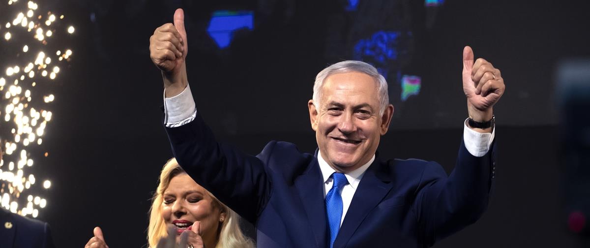 Ο πρωθυπουργός του Ισραήλ μίλησε για τη «νύχτα μιας μεγάλης νίκης» έχοντας στο πλευρό του στο Τελ Αβίν τη σύζυγό του Σάρα η οποία ήταν συγκινημένη.