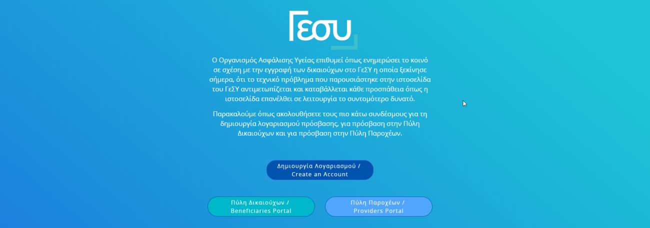 Οι πολίτες λόγω του τεχνικού προβλήματος που παρουσιάστηκε στην ιστοσελίδα του ΓΕΣΥ μπορούν να χρησιμοποιήσουν εναλλακτικά και μέχρι την αποκατάσταση του, μέσω του ακόλουθου συνδέσμου: https://portal.gesy.org.cy.