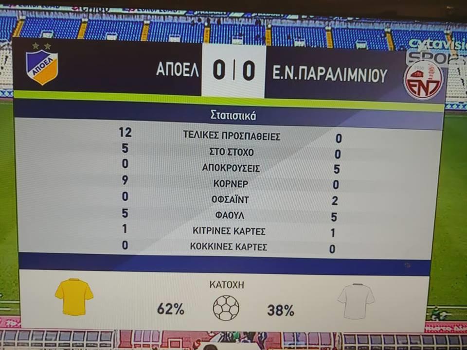 Πιο συγκεκριμένα η ομάδα της Λευκωσίας δημιούργησε 12 τελικές προσπάθειες με πέντε από αυτές να είναι στον στόχο, ενώ δεν άφησε τον σύλλογο του Παραλιμνίου να καταγράψει ούτε μία τελική προσπάθεια.