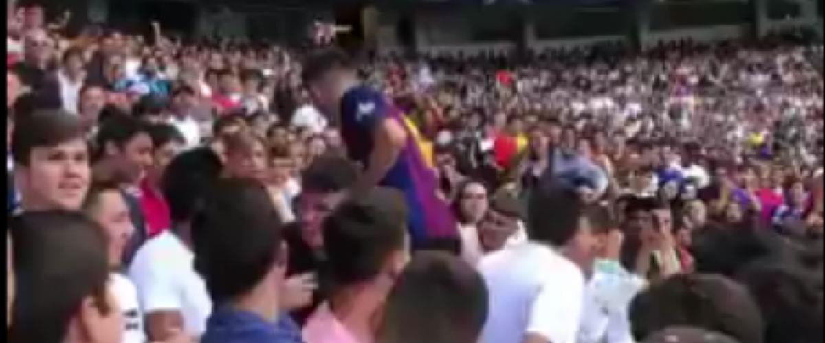 Στη γιορτή της, όμως, υπήρξε και ένας απρόσκλητος και μάλλον ανεπιθύμητος επισκέπτης, αφού στις εξέδρες του Santiago Bernabeu έκανε την εμφάνιση του ένας... ωραίος τύπος με τη φανέλα της Μπαρτσελόνα. Την οποία, πάντως, έβγαλε λίγο μετά, όπως του ζήτησαν οι Μαδριλένοι στις εξέδρες, αφήνοντας τον πάντως, κανονικά, να δει την παρουσίαση.