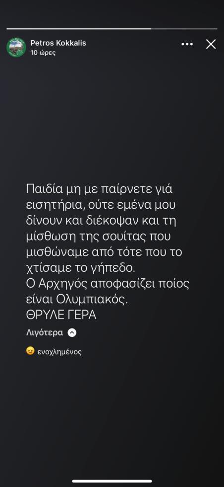 «Παιδιά, μην με παίρνετε για εισιτήρια, ούτε εμένα μου δίνουν και διέκοψαν και τη μίσθωση της σουίτας που μισθώναμε από τότε που χτίσαμε το γήπεδο. Ο Αρχηγός αποφασίζει ποιος είναι Ολυμπιακός. Θρύλε γερά» έγραψε ο Πέτρος Κόκκαλης.