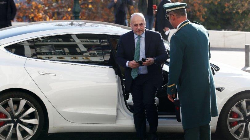 Με το λευκό Tesla Model 3 έφτασε στη συνάντηση των Big 4 ο Γιάννης Αλαφούζος...