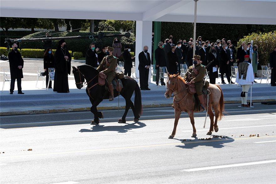 Παράλληλα, περέλασαν 15 ιππείς με άλογα της Διεύθυνσης Ιππικού Τεθωρακισμένων, φορώντας στρατιωτικές ενδυμασίες του 1821, των βαλκανικών πολέμων και στολές από τον 1ο και τον 2ο Παγκόσμιο Πόλεμο καθώς και σύγχρονες. Θα κρατούν ιστορικές σημαίες από τους αγώνες του έθνους.