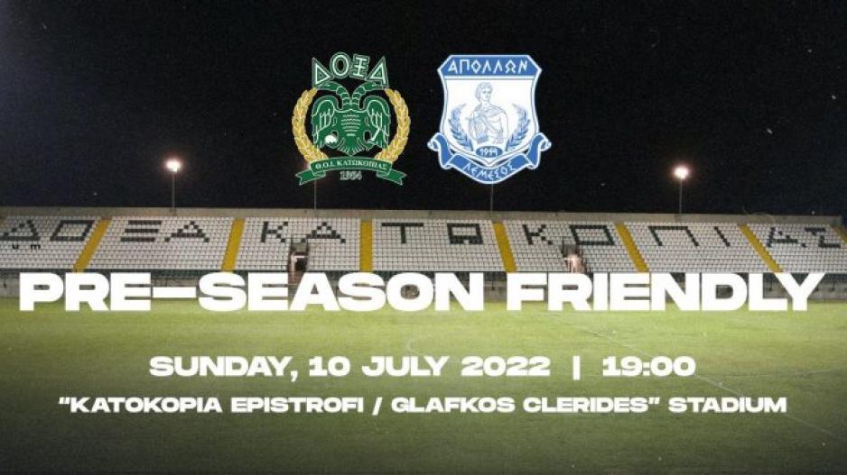 «Η Εταιρεία Απόλλων Ποδόσφαιρο (Δημόσια) Λτδ ενημερώνει ότι την Κυριακή (10/07, 19:00) θα διεξαχθεί ο φιλικός αγώνας με αντίπαλο τη Δόξα, στο νέο γήπεδο Περιστερώνας «Κατωκοπιά Επιστροφή / Γλαύκος Κληρίδης».