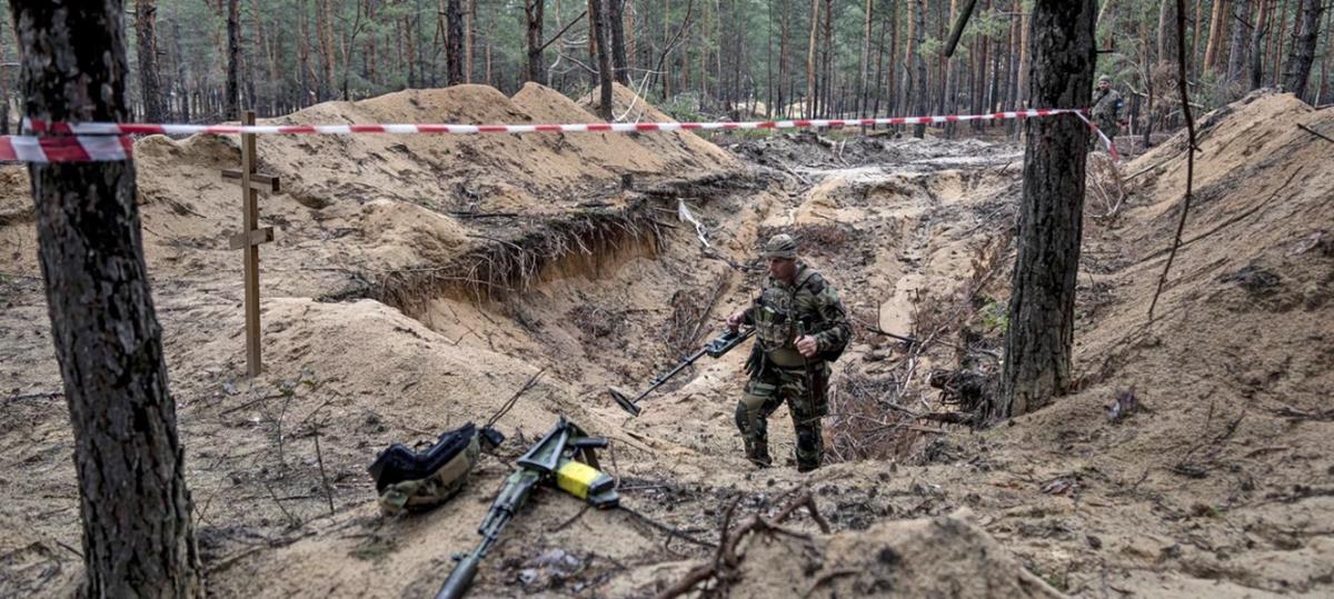 Φωτογραφίες που έδωσαν στη δημοσιότητα διεθνή ειδησεογραφικά πρακτορεία και το υπουργείο Άμυνας της Ουκρανίας δείχνουν πολυάριθμους σταυρούς πάνω σε τάφους σε δασώδη περιοχή κοντά στο Ιζιούμ καθώς και ένα μεγαλύτερο λάκκο.