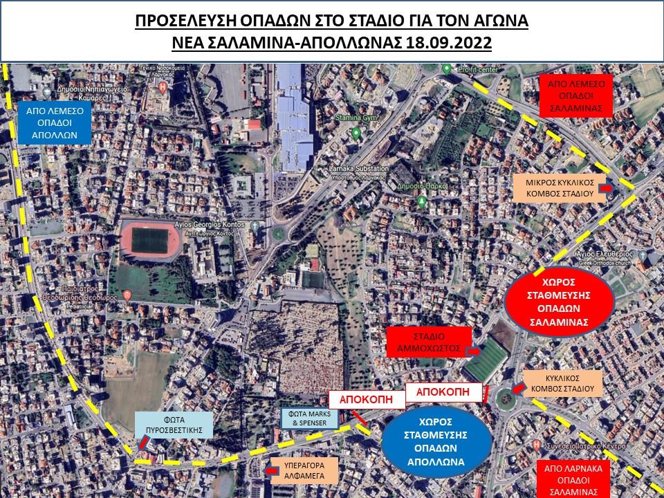 Σχετικό σχεδιάγραμμα των δρομολογίων των οπαδών της ΝΕΑΣ ΣΑΛΑΜΙΝΑΣ και του ΑΠΟΛΛΩΝΑ, καθώς και των χώρων στάθμευσής τους, επισυνάπτεται.