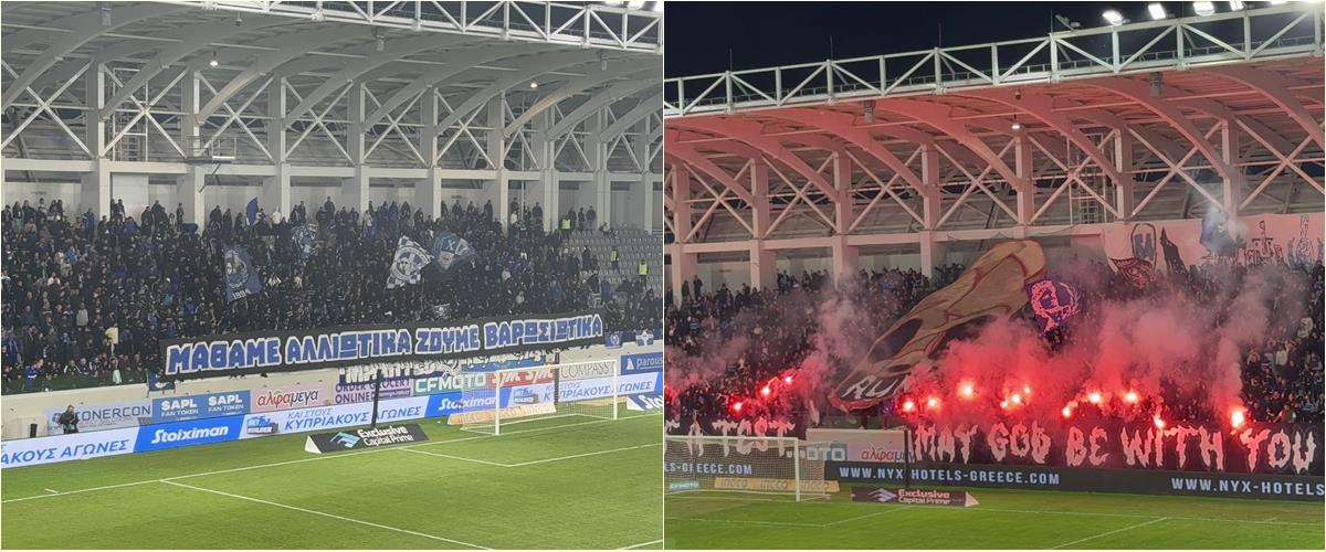 Με φωτοβολίδες και διάφορα συνθήματα, οι οπαδοί ντόπαραν τους ποδοσφαιριστές τους, για να τους χαρίσουν τη νίκη.