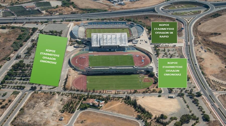 Οι φίλαθλοι της ΟΜΟΝΟΙΑΣ θα καταλάβουν τις Δυτικές, Βόρειες και Ανατολικές κερκίδες του Σταδίου, ως εκ τούτου προτρέπονται να κατευθυνθούν στο Στάδιο μέσω της Λεωφόρου Σπύρου Κυπριανού και των Φώτων Τροχαίας Ορφανίδη. Να σταθμεύσουν τα οχήματα τους στους χώρους στάθμευσης οχημάτων.