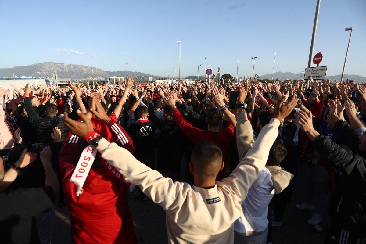 Χιλιάδες οπαδοί του Ολυμπιακού βρέθηκαν σήμερα (3/5) το πρωί στο "Ελευθέριος Βενιζέλος" και αποθέωσαν την αποστολή της ομάδας στην επιστροφή της από την Αγγλία, δημιουργώντας καταπληκτική ατμόσφαιρα.