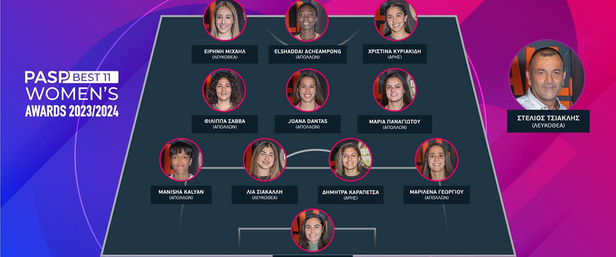 Περισσότερες από τις μισές ποδοσφαιρίστριες της κορυφαίας ενδεκάδας του γυναικείου πρωταθλήματος ανήκουν στο ρόστερ της Apollon Ladies, όπως ανακοινώθηκε σήμερα στα «PASP BEST11 WOMEN’S AWARDS 2023-24», τα οποία μεταδόθηκαν από το κανάλι του Συνδέσμου στο YouTube. Είναι ενδεικτικό ότι ανάμεσα στις τοπ έντεκα, συμπεριλαμβάνονται εφτά ποδοσφαιρίστιες των κυανολεύκων, ενώ από δύο έχουν ο Άρης και η Λευκοθέα Λατσιών. Τις απονομές των βραβείων πραγματοποίησαν ο πρόεδρος του ΠΑ.Σ.Π. Σπύρος Νεοφυτίδης και εκ μέρους του εστιατορίου Buffalo Wings & Rings στη Λεμεσό, ο Fouad Batshon.
