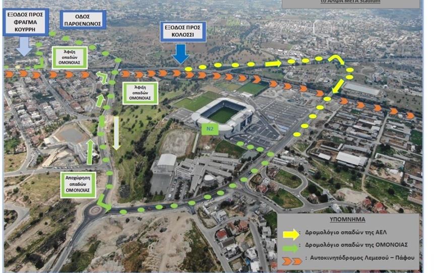 Για την ομαλή προσέλευση και αποχώρηση τους προς και από το στάδιο, οι οπαδοί της ομάδας ΟΜΟΝΟΙΑ καλούνται να κατευθυνθούν προς το ΑΛΦΑΜΕΓΑ Stadium, μέσω του αυτοκινητόδρομου προς Πάφο, να ακολουθήσουν την έξοδο προς Φράγμα Κούρρη και στη συνέχεια μέσω της οδού Παρθενώνος (1ο στρίψιμο δεξιά). Ακολούθως από την 1η έξοδο (αριστερά) του νέου κυκλικού κόμβου, να κατευθυνθούν προς το στάδιο.
