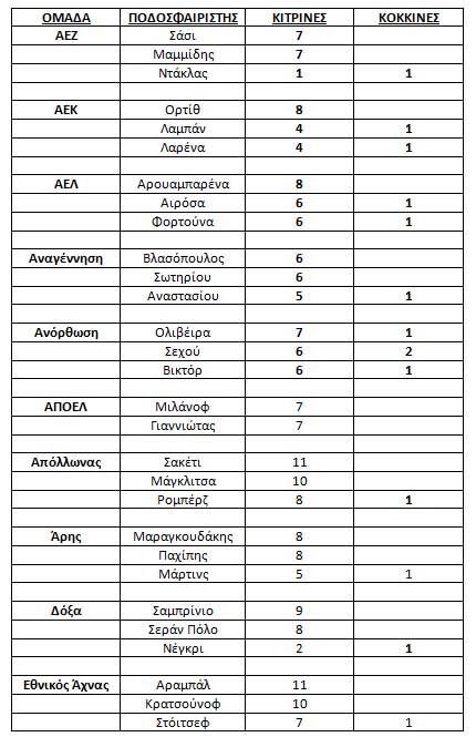 Δείτε αναλυτικά από κάθε ομάδα τους ποδοσφαιριστές που δέχθηκαν τις περισσότερες κάρτες: