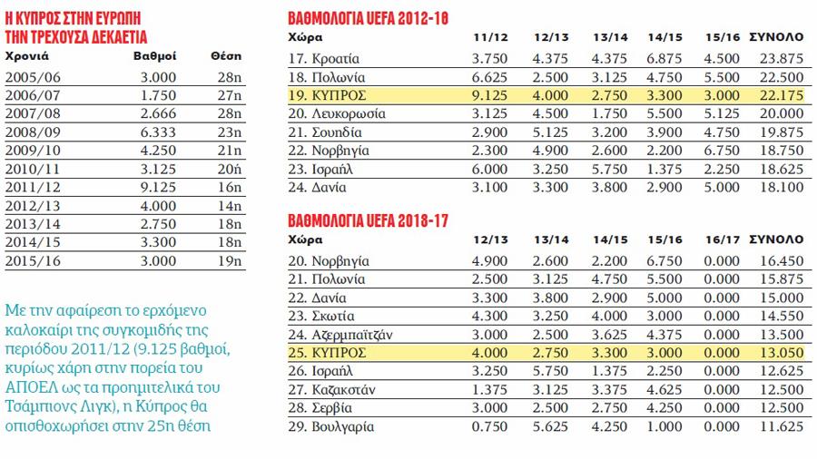 Με την αφαίρεση το ερχόμενο καλοκαίρι της συγκομιδής της περιόδου 2011/12 (9.125 βαθμοί, κυρίως χάρη στην πορεία του ΑΠΟΕΛ ως τα προημιτελικά του Τσάμπιονς Λιγκ) η Κύπρος θα οπισθοχωρήσει στην 25η θέση, από την οποία θα ρίξει –την ευρωπαϊκή σεζόν 2016/17– την τελευταία ζαριά της, για να αποφύγει την επιστροφή στην ποδοσφαιρική ανυποληψία.