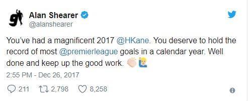 Μάλιστα ο Άλαν Σίρερ μέσω twitter έστειλε τα συγχαρητήριά του στον Κέιν, γράφοντας χαρακτηριστικά: «Είχες ένα εκπληκτικό 2017 Χάρι Κέιν. Δικαιούσαι να έχεις το ρεκόρ των γκολ στην Πρέμιερ Λιγκ μέσα σε ένα ημερολογιακό έτος. Συγχαρητήρια και συνέχισε την καλή δουλειά».