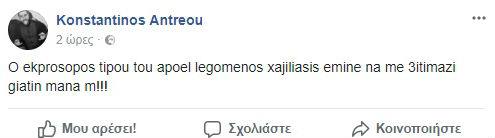 Ο φουτσαλιτσής της Ομόνοιας, Κωνσταντίνος Αντρέου, με ανάρτησή του στο facebook καταγγέλλει τον εκπρόσωπο Τύπου του σωματείου ΑΠΟΕΛ για εξύβριση στο σημερινό (25/01) ντέρμπι του φούτσαλ ανάμεσα στις δύο ομάδες.