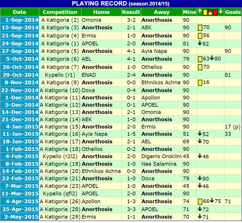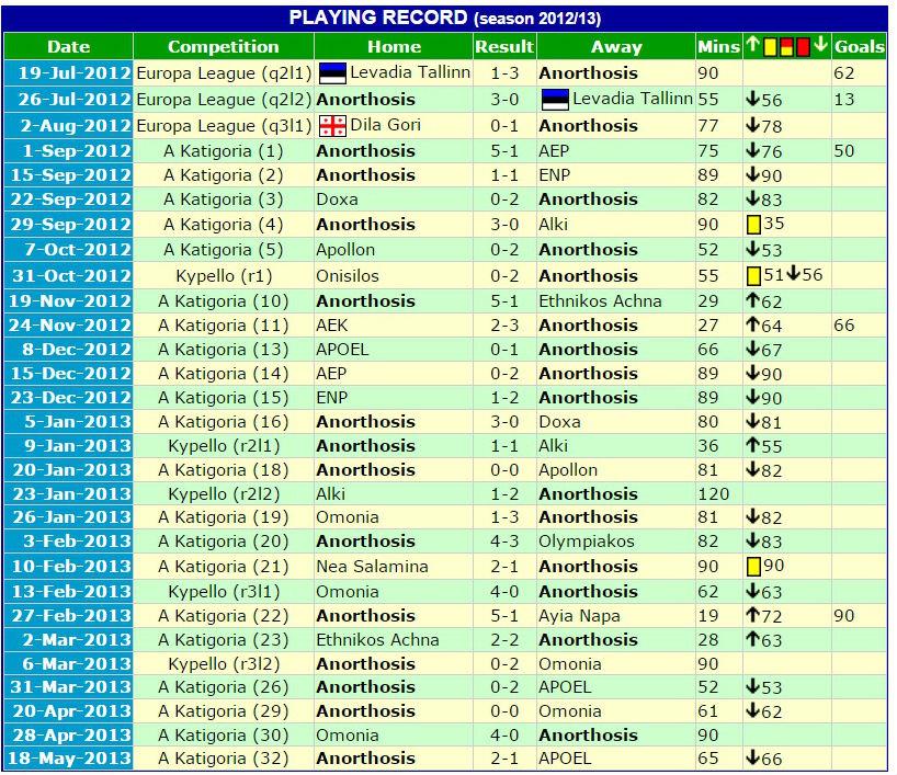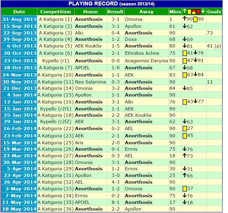 Αναλυτικά, τη σεζόν 2012-13 αγωνίστηκε σε 29 παιχνίδια (21 πρωτάθλημα, 5 κύπελλο, 3 Europa League), 28 την περίοδο 2013-14 (25 πρωτάθλημα, 3 κύπελλο), 27 την χρονιά 2014-15 (24 πρωτάθλημα, 3 κύπελλο) και 15 εμφανίσεις στη φετινή σεζόν (12 πρωτάθλημα, 3 κύπελλο)