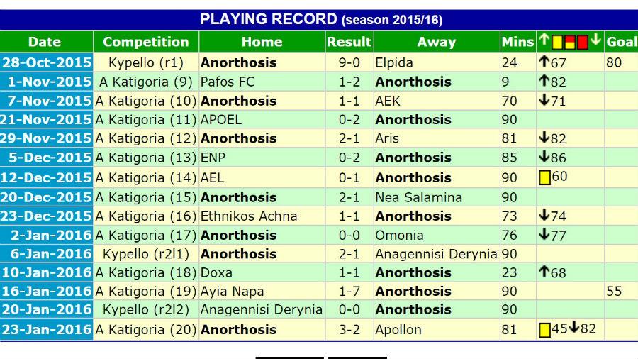 Πιο κάτω παραθέτουμε αναλυτικά τις εμφανίσεις του Κάλβο στην Ανόρθωση ανά σεζόν.
