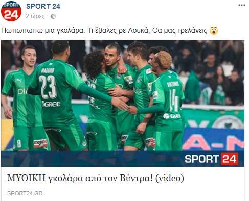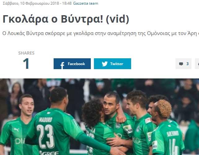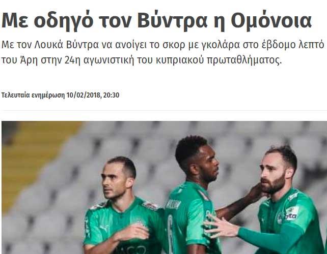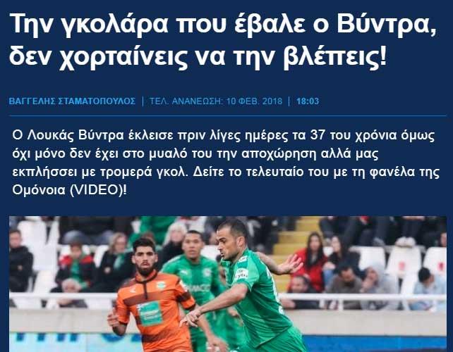 Το γύρω της Ελλάδας κάνει το εκπληκτικό γκολ του Λουκά Βύντρα στον αγώνα της Ομόνοιας με τον Α΄ρη για την 24η αγωνιστική του πρωταθλήματος. Ο Ελλαδίτης αμυντικός των «πρασίνων» με φοβερό σουτ στην κίνηση έδωσε προβάδισμα στο τριφύλλι στο 8’ πετυχαίνοντας το πρώτο φετινό του τέρμα στο πρωτάθλημα και τρίτο με τη φανέλα της Ομόνοιας.
