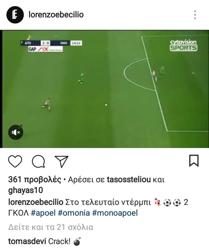 «Crack», έγραψε ο Αργεντινός και συνόδευσε την απάντηση του με μια «βόμβα», παραλληλίζοντας την με τα δυνατά σουτ του Εμπεσίλιο που νίκησαν δις τον τερματοφύλακα της Ομόνοιας, Χριστοδούλου.